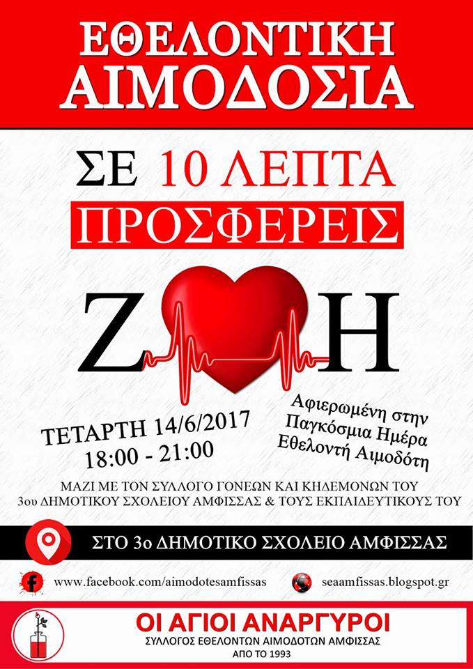 Η αιμοδοσία θα πραγματοποιηθεί στους χώρους του 3ου Δημοτικού σχολείου Άμφισσας απο τις 18.00 μέχρι τις 20.30.